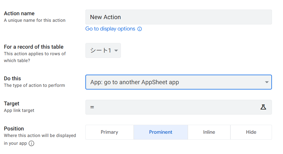For a record of this tableでアクションが適用されるテーブルを選択します。Do thisの項目でApp: go to another AppSheet appを選択します。