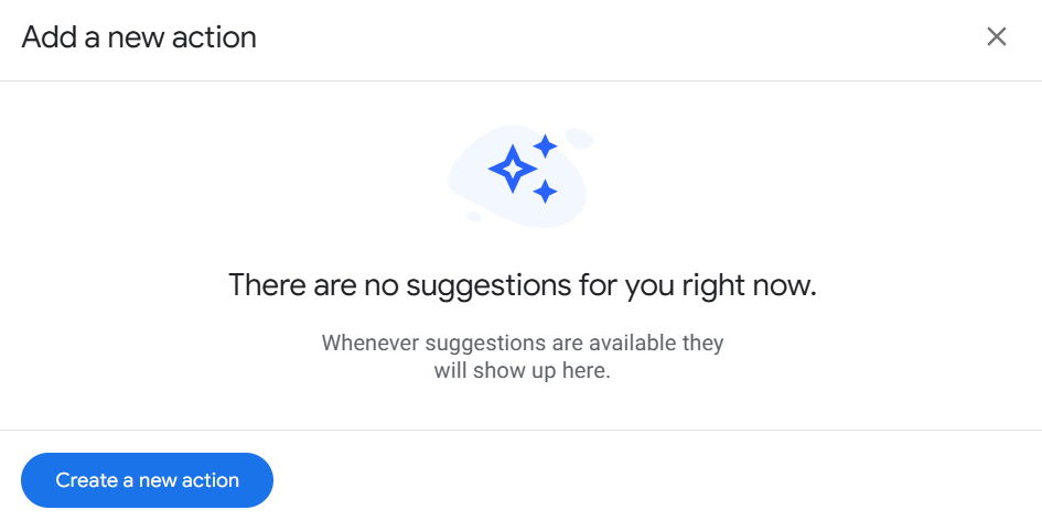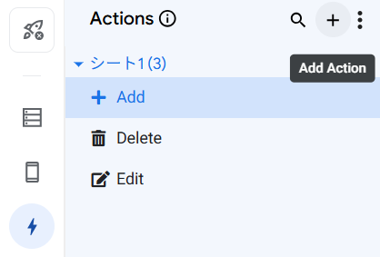 画面遷移するためのアクションを新しく作成します。[Actions]に移動し、[Actions]パネルの上部ヘッダーにある[+]をクリックして、[Create a new action]をクリックします。