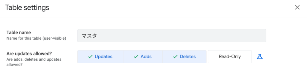 対象のデータを選択して、以下のアイコン(Table settings)を選択します。